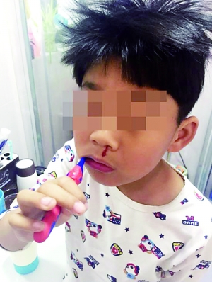 家长上传的自称孩子洗漱时无故留鼻血的照片。