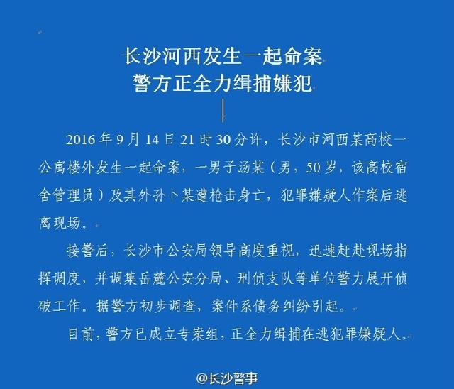原标题:长沙一高校公寓2人遭枪击身亡 警方正缉捕嫌犯