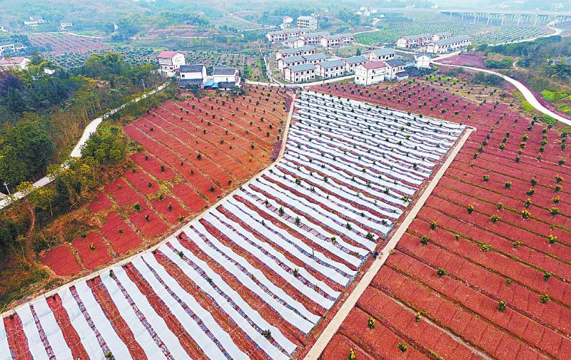 俯瞰广安市广安区龙安乡勇敢村,该村被大片的产业包围。勇敢村位于大云山腹地,通过大力发展龙安柚、桃李等产业,2016年人均收入过万,142名贫困人口实现脱贫,摘掉贫困村帽子。 (记者 李向雨 摄)