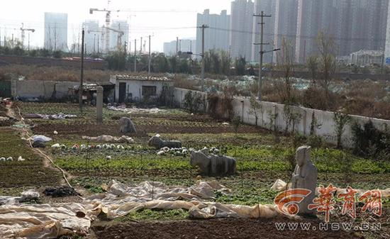 16日下午,华商报记者在航天基地神舟大道附近找到这片被围墙围起来的墓地,墓地位于一片围挡之间。根据墓地旁的石碑显示,该墓地是全国第六批重点文物单位——明秦王墓(宣王朱怀埢墓),主墓封土东西30米、南北28米,这一区域专门用围墙围了起来,只有一个铁门可以出入,铁门上着锁。从高处往墓地里看,墓地里确实种着各种蔬菜,墓地里的石像就像摆放在菜园里一样。