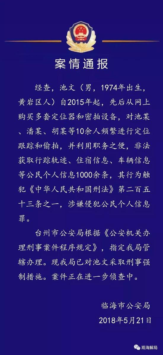 临海市公安局发布“案情通报”称:经查,池文(男,1974年出生,黄岩区人)自2015年起,先后从网上购买多套定位器和密拍设备,对池某、潘某、胡某等10余人频繁进行定位跟踪和偷拍,并利用职务之便,非法获取行踪轨迹、住宿信息、车辆信息等公民个人信息1000余条,其行为触犯《中华人民共和国刑法》第二百五十三条之一,涉嫌侵犯公民个人信息罪。台州市公安局根据《公安机关办理刑事案件程序规定》,指定我局管辖办理。现我局已对池文采取刑事强制措施。案件正在进一步侦查中。