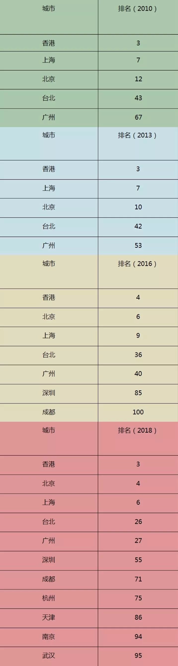伦敦和纽约的地位,不可撼动。今年全球一线城市的变化在于,香港前进一名入围前三,北京首次进入“四强”。