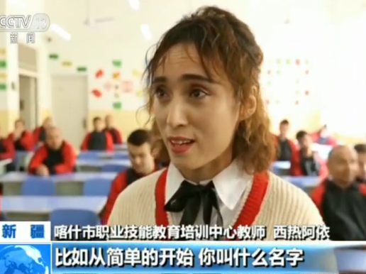 喀什市职业技能教育培训中心教师 西热阿依:比如从简单的开始,你叫什么名字,你家有多少人,最基本的对话交流开始,也加法律知识,把他们宗教极端思想解除掉。