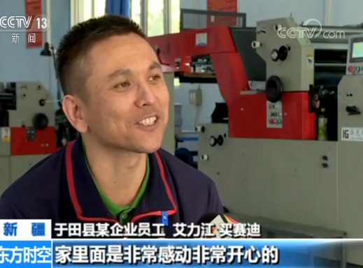 于田县职业技能教育培训中心学员 艾力江·买赛迪:我这个月拿了2800,我自己留了两百零花钱,然后2600寄给家里了。家里面是非常感动非常开心的,他们都觉得不可思议,我能给他们挣钱,他们都不可思议。