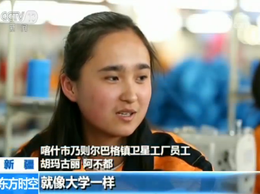 喀什市乃则尔巴格镇卫星工厂员工 胡玛古丽·阿不都:这是真的,就像大学一样,一边工作一边学习,还有文化活动,了解新疆历史,了解我们中华文化。我结业以后发现自己没学的东西还多着呢,好多东西来不及学习就毕业了。如果有机会的话,我有时间(想)去那边参观参观,跟那边的同学们聊聊天,打打招呼。