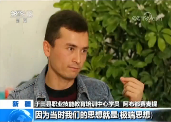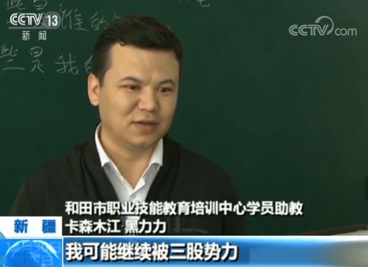 于田县职业技能教育培训中心学员 木塔里普:当时他给我们说,有条件的话我们把“卡菲尔”(异教徒)们,一定要杀他们,消灭他们。政府给我们盖的安居房还有马路都是“非穆斯林”(建的),我们应该不住在那个安居房,应该必须要做礼拜,吉哈德(“圣战”),还有学经,没有(不要)去学校。