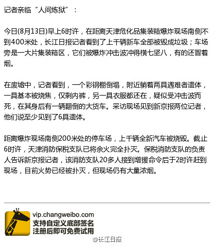 #天津滨海新区开发区大爆炸# 【直击现场记者 将爆炸后的区域比作人间炼狱】(长江日报记者柯立)