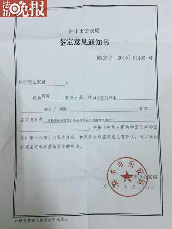 记者看到了高女士出示的广东省陆丰市公安局9月25日出示的尸检鉴定书,林小伟“系枪弹创导致急性失血性休克及右侧血气胸死亡”。