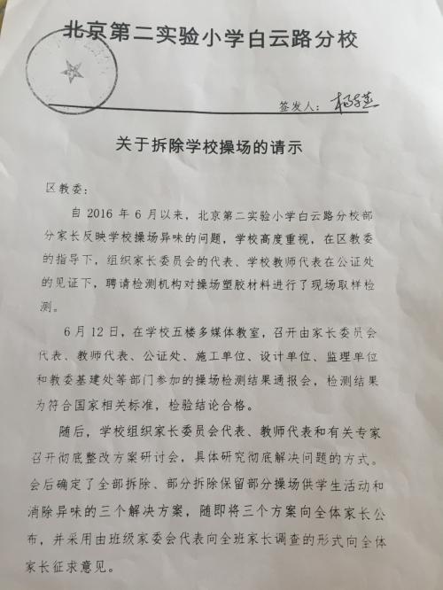 西城区教委所提供的《北京第二实验小学白云路分校关于拆除学校操场的请示》一文写到:自2016年6月以来,北京第二实验小学白云路分校部分家长反 映学校操场异味的问题,学校组织家长委员会代表、教师代表和有关专家召开彻底整改方案研讨会,会后确定了三个解决方案,并采用由班级家委会代表向全班家长 调查的形式向全体家长征求意见。