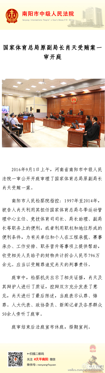 中新网9月1日电 据河南省南阳市中级人民法院官方微博消息,今日上午,河南省南阳市中级人民法院一审公开开庭审理了国家体育总局原副局长肖天受贿一案。