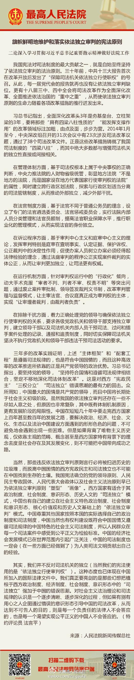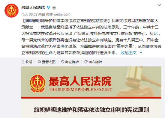 [旗帜鲜明地维护和落实依法独立审判的宪法原则]我国宪法对司法制度的最大贡献之一,就是自始至终坚持了依法独立审判的法治原则。三十年前,中共十三大报告首次在改革开放后发出了“保障司法机关依法独立行使职权”的号召。从此,每一届党代会的报告就再也没有让依法独立审判缺位。更有十八届三中、四中全会将司法改革作为全面深化改革、全面推进依法治国的“重中之重”,从而使依法独立审判原则的生命力随着各项改革措施的推行迸发出来。
