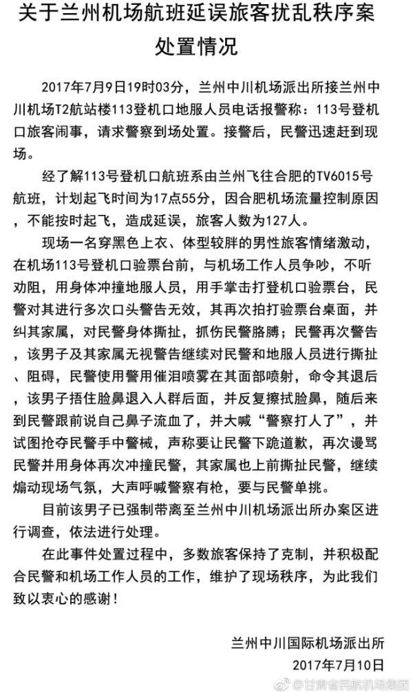 甘肃省民航机场集团官方微博7月10日10时14分消息:《关于兰州机场航班延误旅客扰乱秩序案处置情况通报》,并称,由于天气等不可抗力的因素造成的航班延误给广大旅客带来的出行不便,我们深感抱歉。愿我们在出行路上多一份理解和宽容。