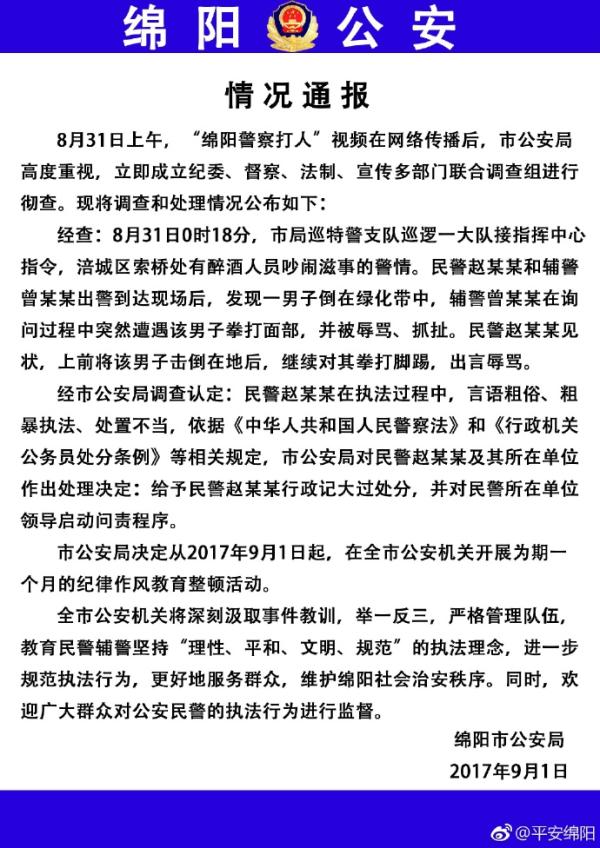 关于8月31日“绵阳警察打人视频”调查处理的情况通报 。