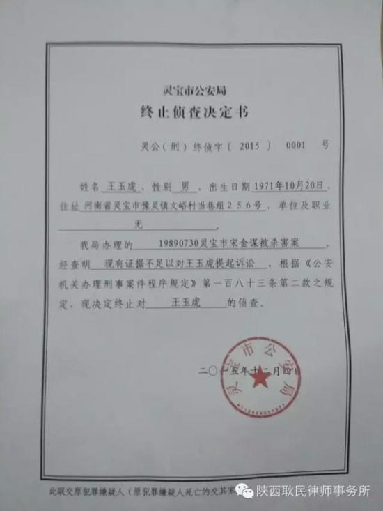 原标题:河南王玉虎案追踪 公安局发终止侦查决定书