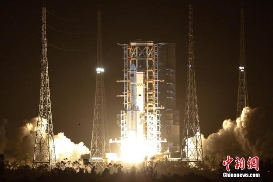 “长征七号”运载火箭在海南文昌航天发射场点火升空。 中新社发 何卫国 摄