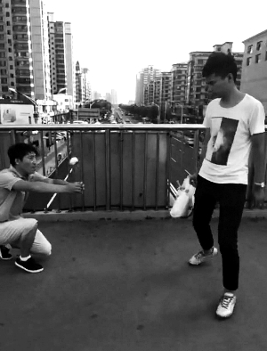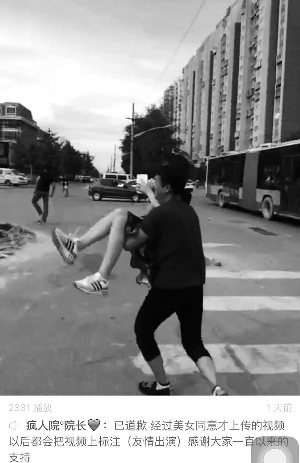 记者观看了“疯人院院长”的全部视频,发现其拍摄的内容均与恶搞陌生人有关。最近录像的拍摄地点在马路上,只见该男子冲着一女子身后跑过去,迅速将女子抱起,通过马路,而后将其放下(如图一)。被抱起的女子显然受到了惊吓,一直挣扎着喊道:“谁啊,你谁啊?!”另一点击量最高的视频则是在某网吧里,男子坐到一位正在打游戏的顾客旁,先是攀谈了两句,然后男子突然将顾客的椅子撤走,转身拔腿就跑。此外,该男子还有在商店里试女士内衣、亲吻路人、过街天桥上随机求婚(如图二)、地铁里装死等不同的恶搞内容。