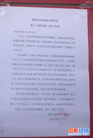 雄县住建局的公开信。中新经纬 刘雪玉摄