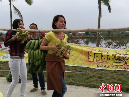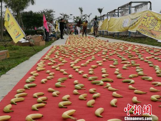 中新网南宁4月3日电 (记者 林浩)4月2日,在全国最大的香蕉基地--金穗生态园,一条由数十吨香蕉铺设的380米长的“香蕉跑道”亮相,游客们进行“疯狂的香蕉”赛跑比赛,并开展“抛香蕉”、香蕉定情、撩香蕉鱼等活动,欢度“三月三”假期。