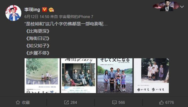 李现:没有啊,我推荐的电影也有豆瓣七分多的,你看《河神》都八分多了。就是提高大家的审美嘛,知道什么是好的。是不是看了这些东西,对生活有不一样的体验。是枝裕和的电影不会告诉你生活有什么,要反抗,而是告诉你,生活很细腻,你可以发现很多美好的小东西。