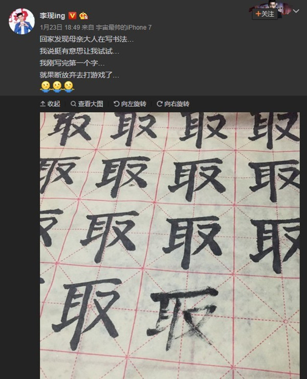 李现:我生活中还挺宅的,喜欢打游戏、健身、看电影、看书,然后弹吉他,喜欢练钢笔字。最近在练楷书。发觉自己有情绪或者说是不太开心的时候,就会用练字来排解这种不好的情绪。写字的时候就不会想这些事,只想着一撇一捺写的怎样。