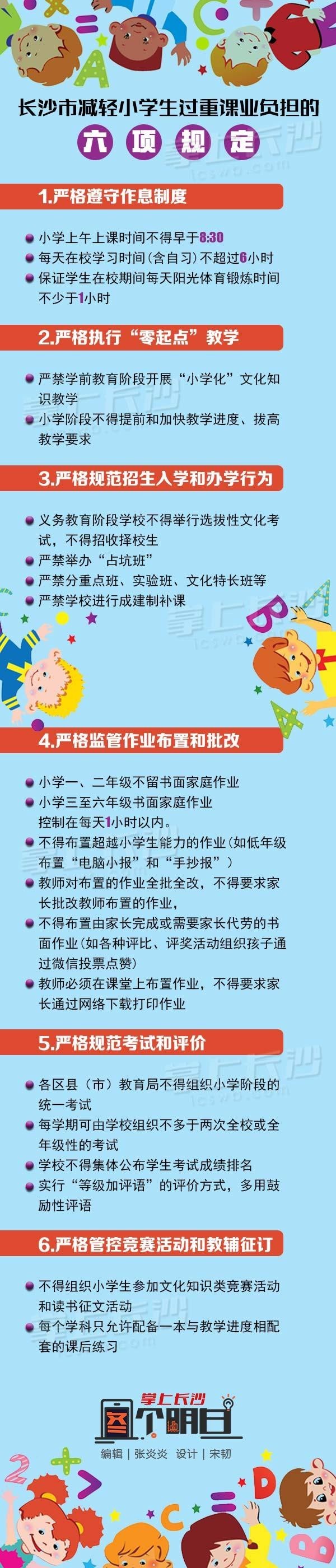 2017年1月1日长沙市发布《长沙市减轻小学生过重课业负担的六项规定(试行)》,其中就明确规定:“不得要求家长批改教师布置的作业,不得布置由家长完成或需要家长代劳的书面作业。”