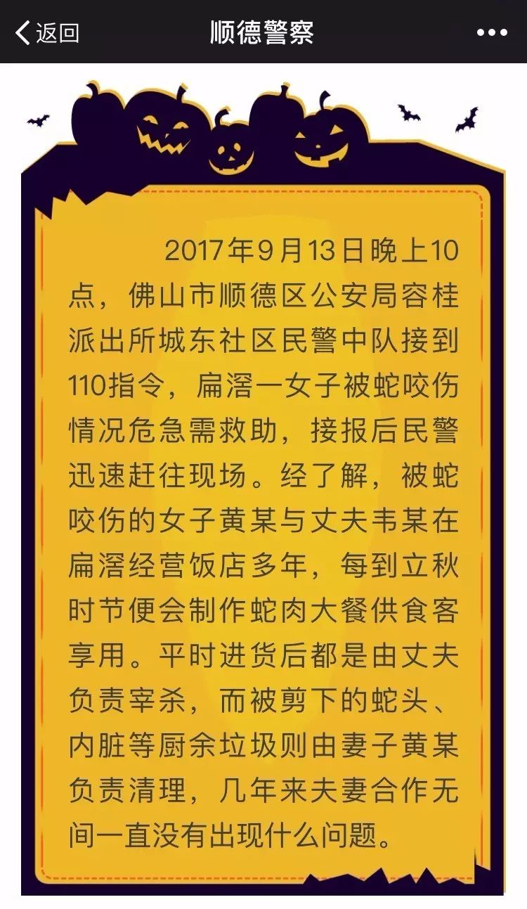 据顺德区公安局官方微信公众号“顺德警察”9月19日的通报,9月13日晚上10点,顺德区公安局容桂派出所城东社区民警中队接报称,容桂扁滘一女子被蛇咬伤,情况危急需救助,接报后民警迅速赶往现场。
