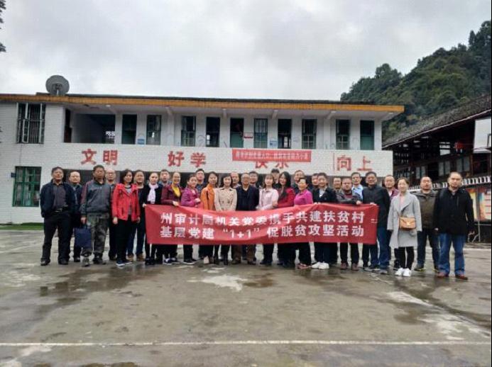 近日,湖南湘西自治州审计局全体干部职工,深入扶贫联系村开展结对共建活动,用实际行动践行党的十九大精神。活动中,该局干部职工上门入户了解贫困户一年的生产生活、收入开支情况,为他们谋划来年发展出点子、提建议,还为贫困户送上面条、食用油、糖果、牛奶等食品。该局两个机关支部与村党支部联合开展主题党日活动,共同学习党的十九大精神,党员们纷纷表示将用手中审计监督利剑助力脱贫攻坚、用结对帮扶的实际行动助力脱贫攻坚。图为湘西州审计局干部职工与盘草村村干部合影。(李畅舞)