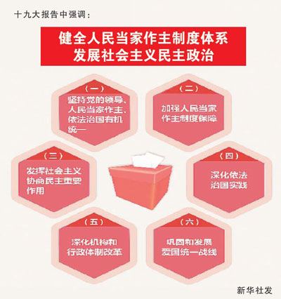 积极发展社会主义民主政治,是我国民主法治建设的重要内容。十九大报告强调,要长期坚持、不断发展我国社会主义民主政治,积极稳妥推进政治体制改革,推进社会主义民主政治制度化、规范化、程序化,保证人民依法通过各种途径和形式管理国家事务,管理经济文化事业,管理社会事务。十九大报告中提出:“我国社会主义民主是维护人民根本利益的最广泛、最真实、最管用的民主。发展社会主义民主政治就是要体现人民意志、保障人民权益、激发人民创造活力,用制度体系保证人民当家作主。”围绕如何用制度体系来保证人民当家作主,十九大报告提出了一系列新思想新举措,包括加强人民当家作主制度保障、深化依法治国实践等方面,我们一定要认真学习、深刻领会。