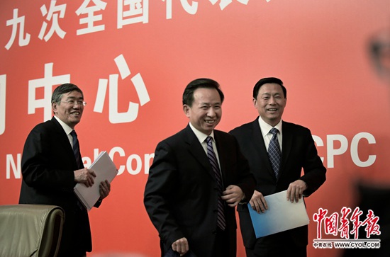 10月23日,十九大新闻中心在梅地亚中心举办第六场记者招待会,中央财经领导小组办公室副主任杨伟民(左一),环境保护部党组书记、部长李干杰(左二)介绍“践行绿色发展理念、建设美丽中国”有关情况,并回答记者提问。中国青年报·中青在线记者 赵青/摄