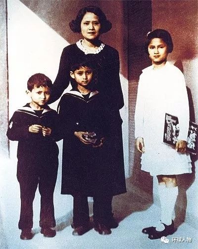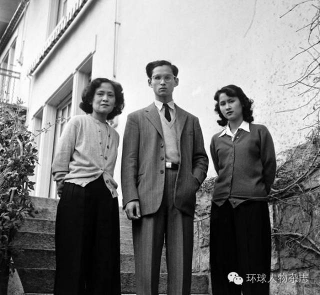 1945年,普密蓬(中)与母亲(左)及姐姐在瑞士洛桑的住所前合照。