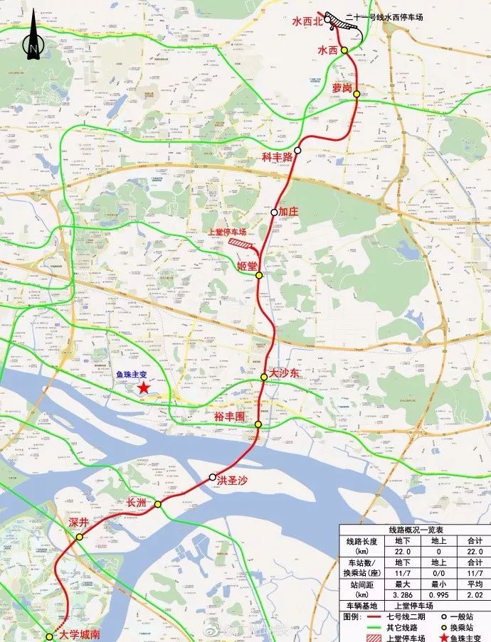 据了解,七号线二期全长约22公里,采用地下方式敷设,它起于现有一期的大学城南站,然后向北延伸至黄埔区,设有深井、长洲、洪圣沙、裕丰围、大沙东、姬堂、加庄、科丰路、萝岗、水西、水西北等11座车站(除已运营车站外,其余站名均为工程暂定名)。