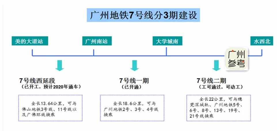 据了解,广州轨道交通7号线共分3期建设,其中一期工程(广州南站~大学城南)已于2016年12月28日正式开通。西延顺德段(广州南站——美的大道站)已于去年全面开工,该线路从广州南站西延至顺德的美的大道站,预计将于2020年建成通车。而二期工程(大学城南—水西北)已获市发改委批复,可以动工建设。