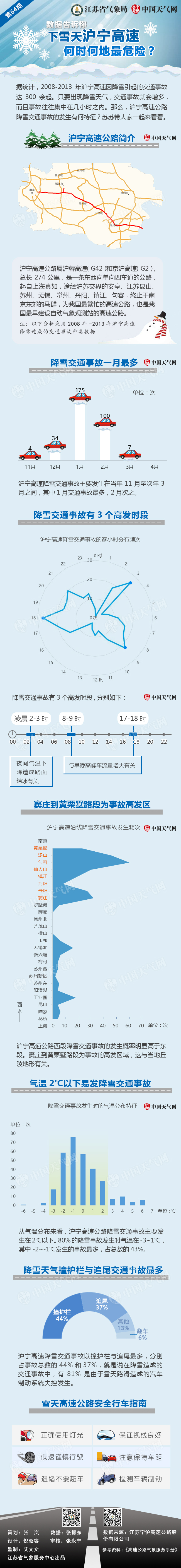 沪宁高速因降雪引起的交通事故主要发生在当年11月至次年3月之间,其中1月交通事故最多,2月次之。降雪交通事故有三个高发时段:凌晨2-3时、8-9时、17-18时。根据时间段来看:2-3时夜间气温下降造成路面结冰有关,8-9时和17-18时为事故高峰,与这两个时段车流量增大有关。