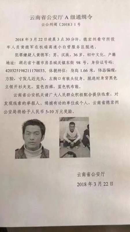 3月22日22时许,春城晚报记者从云南省公安厅获悉,3月22日凌晨3时30分许,德宏州看守所民警押解在押人员前往昆明投狱途中,被押解人员黄德军(男,汉族,36岁,初中文化,湖北房县人)在杭瑞高速小白营服务区(位于大理州境内)脱逃。