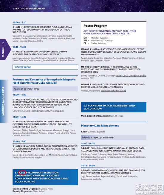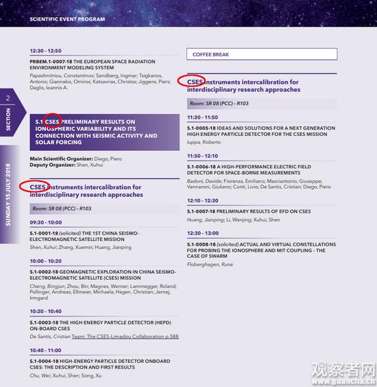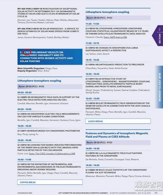 COSPAR大会会议手册的第122页及第187、188页显示,当地时间7月15日、16日两天,COSPAR大会的确有以“张衡一号”(CSES,China Seismo-electromagnetic Satellite)为主题的行程安排。