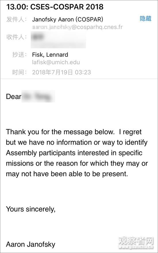 同时,观察者网向COSPAR主席伦纳德·菲斯克(Lennard A。 Fisk)发邮件核实网曝“张衡一号中国专家因签证问题缺席大会”一事。COSPAR秘书处回复邮件称,无法确认参会人员出席或缺席的理由。