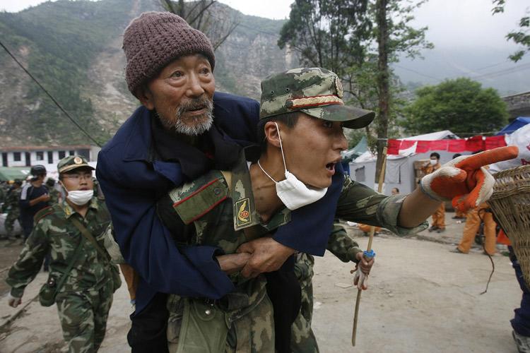 部队医护人员为地震死难同胞默哀。