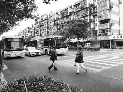 斑马线前,看到有行人过马路,两辆公交车主动停车礼让,行人也疾行通过。本报记者 张源源摄