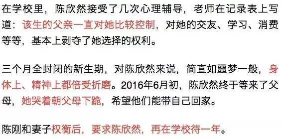 夫妻俩试图找出女儿言行大变的原因,他们跟踪女儿,给女儿朋友的父母打电话,这让陈欣然十分反感:“我没有一点隐私,没有一点空间还没有一个朋友。”