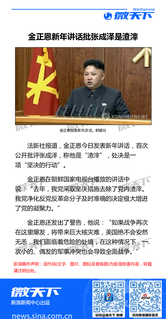金正恩新年讲话批张成泽是渣滓