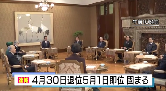 据日本NHK报道,1日,日本召开皇室会议,经过商讨,明仁天皇将于2019年4月30日退位,皇太子同年5月1日即位新天皇并修改元号。天皇皇室会议由担任议长的安倍首相召集,由皇族、宫内厅长官等共10人组成。