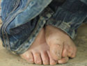 在 M 县严重缺鞋的学生中,14.9 % 的有光脚上学的经历,N 县该比例为 22.9%。一些是因为偶尔没鞋子穿,一些是因为舍不得穿,极个别是因为习惯。光脚时,学生们的脚有时会被扎破或磨破。