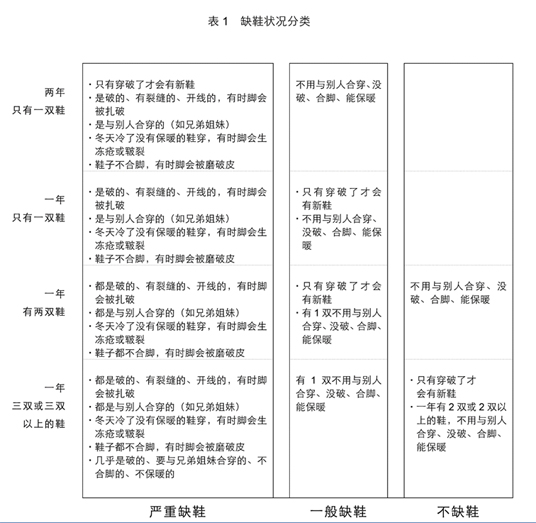 为此,依据不同情况,将小学生缺鞋状况分为三类,“严重缺鞋”、“一般缺鞋”、“不缺鞋”(详细说明见下表 1)。
