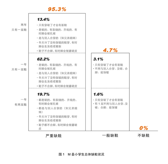 M 县和 N 县均为国家重点扶贫开发县,为《中国农村扶贫开发纲要(2011-2020 年)》规划的 14 个集中连片特殊困难地区县之一。从 M 县和 N 县贫困小学生的穿鞋情况一定程度上可看出贫困地区,特别是集中连片特困地区的小学生缺鞋状况。