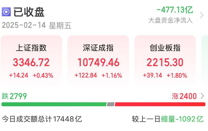 2月14日,A股市场全天震荡反弹,创业板指领涨。沪深两市全天成交额1.72万亿,较上个交易日缩量1048亿。盘面上,市场热点继续围绕AI应用展开,个股跌多涨少,全市场近2800只个股下跌。