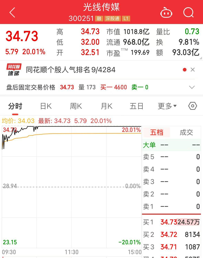光线传媒再度涨停,走出8天6板,8日累计上涨超260%,成交超68亿元,截至收盘股价报34.73元,市值1018.8亿元。