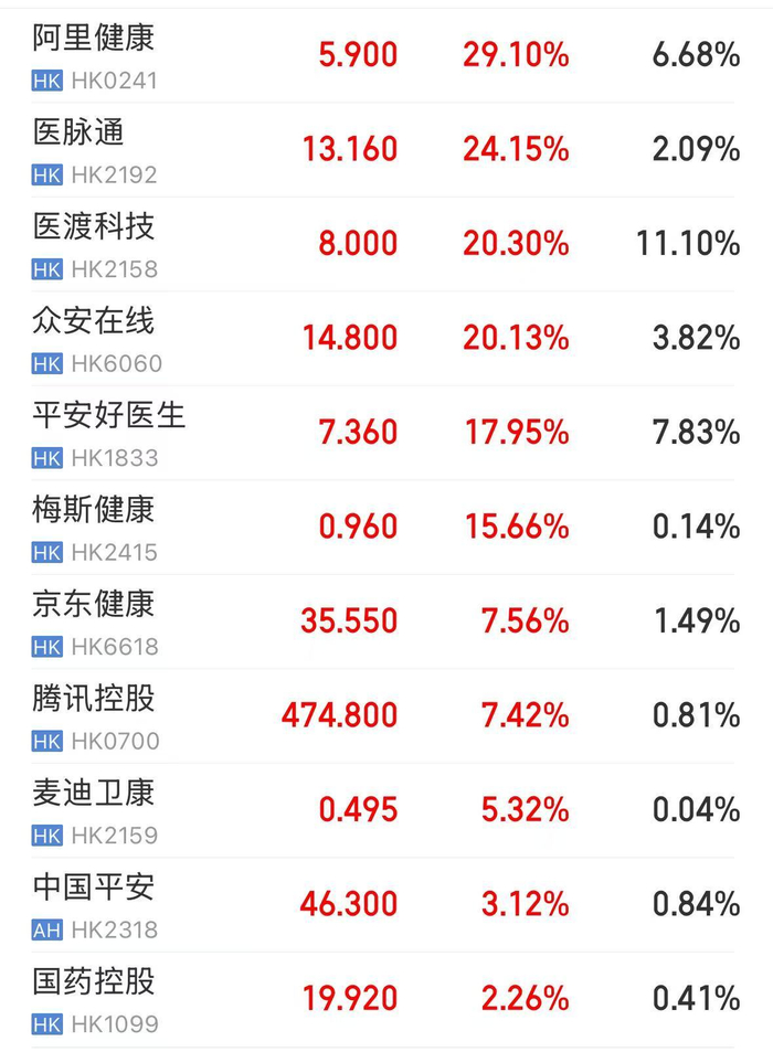 其中,互联网医疗概念股持续走强,阿里健康涨超29%,众安在线涨超20%,平安好医生涨近18%,叮当健康涨超15%,京东健康涨超7%。