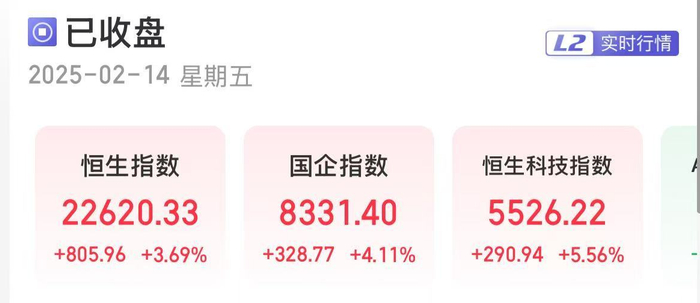 2月14日下午,港股收盘,行情全天高开高走,恒生指数收涨3.69%,恒生科技指数收涨5.56%,国企指数涨4.11%。市场股票呈涨多跌少态势。