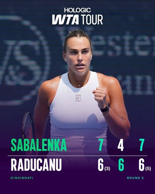 直播吧08月12日讯 WTA1000辛辛那提站第三轮,卫冕冠军、头号种子萨巴伦卡苦战超三小时以7-6(3) 4-6 7-6(5)击败30号种子拉杜卡努,对后者三战全胜,惊险晋级16强。