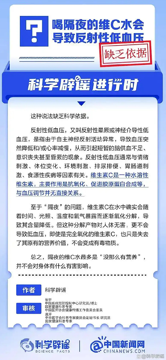 【喝隔夜的维C水会导致反射性低血压?】#中新真探#反射性低血压通常与情绪刺激、体位变化、环境刺激、排尿排便、胃肠道刺激、食源性疾病等因素有关。维生素C是一种水溶性维生素,主要作用是抗氧化、促进胶原蛋白合成等,与血压调节并无直接关系。维生素C在水中确实会逐渐氧化分解,导致其含量降低。
